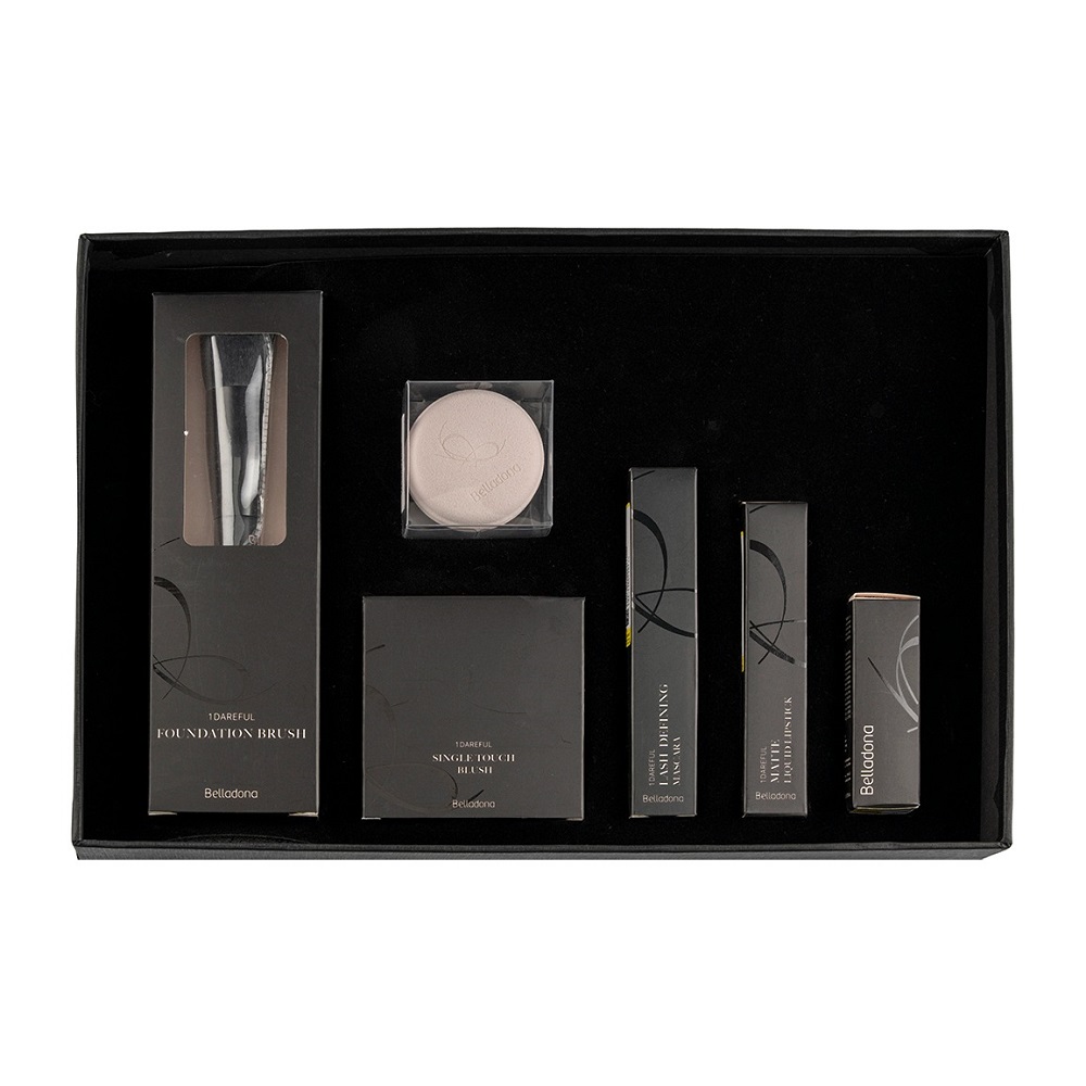 شامل: ریمل حجم دهنده ضدآب، رژ لب جامد ساتین شماره 09، رژ لب مایع براق شماره 02، واندرفول رژگونه شماره 06، براش پودر صورت، پد آرایشی