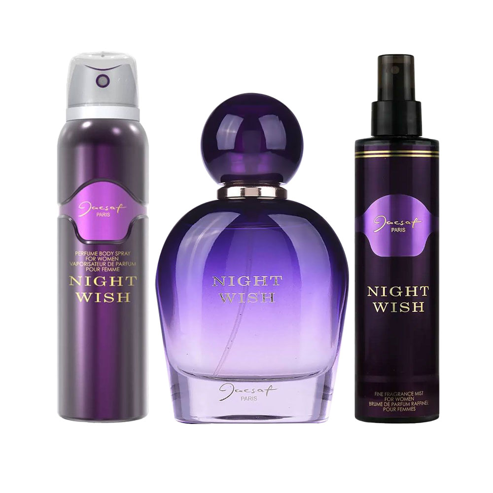 شامل: ادوپرفیوم نایت ویش زنانه 100 میل، اسپری زنانه نایت ویش، بادی اسپلش زنانه نایت ویش 200 میل